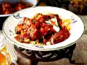 Add the tomato paste, mix in, sauté and deglaze with red wine and tomatoes. Coarsely chop the tomatoes with a spatula. Bring to the boil, cover and braise for approx. 12 minutes.