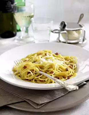 Drain the spaghetti, let it drain and immediately add it to the egg and cheese mixture. Turn the spaghetti in it until everything is covered by a yellow cream. Spread immediately in deep plates and sprinkle with Parmesan cheese