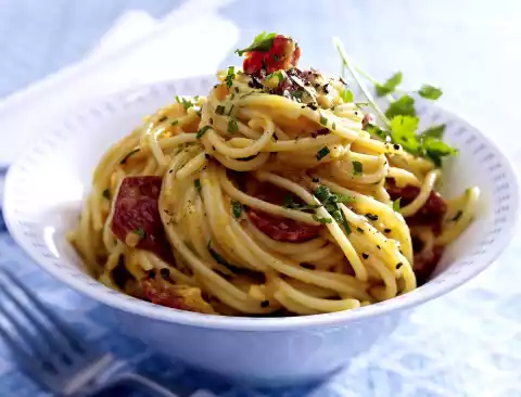 Peel the skin from the chorizo, cut the sausage into slices. Put the pasta in boiling water, cook according to the instructions on the packet. Stir from time to time so they don't stick together.