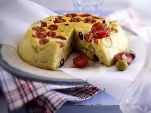 Flip the frittata over onto a plate. Cut into pieces and add tomato and olive salad.