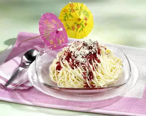 Sprinkle spaghetti ice cream with the raspberry sauce. Sprinkle with chocolate and serve immediately