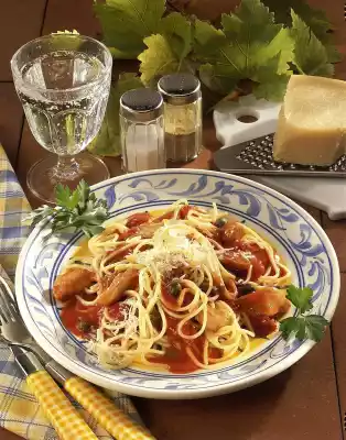 Bring everything to the boil. Drain the capers and add to the sauce. Season with salt, pepper and sugar. Drain the pasta and arrange on plates with the sauce. Sprinkle with parmesan and garnish with parsley