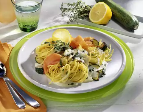 Pluck the remaining leaves from the stems and chop finely. Add thyme to the zucchini. Stir in the sauce thickener and bring to the boil again. Season to taste with lemon juice, salt and pepper. Drain the pasta and arrange on plates with the sauce and salmon. Serve garnished with thyme and lemon slices