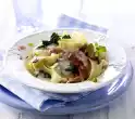 Prepare the pasta in boiling salted water according to the instructions on the packet. Peel and finely chop the onion. Wash the zucchini, quarter them lengthwise and cut into pieces. Melt butter in a pot. Sauté onion and zucchini in it, add stock and cream, bring to the boil and simmer for 5 minutes. Wash the thyme, put something aside for garnishing.