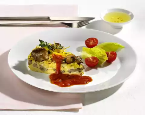Heat 1 tablespoon of oil in an ovenproof pan (24 cm Ø) and fry the mushrooms. Season with salt and pepper, remove and drain on kitchen paper. Mix noodles and mushrooms in the pan.