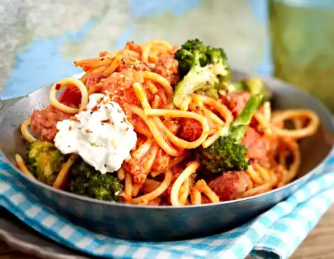 Clean and wash the broccoli and cut it into small florets. Peel and chop the onion. Heat the oil in a large pan with a high rim. Put onion sausage meat in large pieces directly into the pan and fry it while turning.