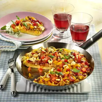 Wash herbs, dab dry. Garnish with 1 stem for each, pluck the leaves from the stems and chop finely. Heat 1 tablespoon of oil in a frying pan and fry the onions until golden brown. Add garlic and fry briefly. Add bell peppers, mushrooms and chopped herbs and steam for about 5 minutes. Heat 2 tablespoons of oil in two large frying pans and put half the pasta in each. Pour whisked eggs over the pasta and let it simmer for about 5 minutes. Spoon the strained tomatoes over the pasta. Add vegetable mushroom mixture, diced tomatoes and feta cheese. Cover and fry on low heat for another 5-10 minutes. Garnish spaghetti pizza with the remaining herbs
