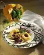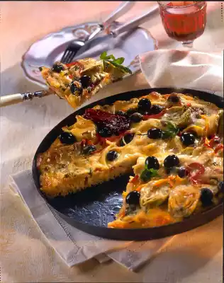 Pour half the sauce over it. Add spring onions, peppers, olives, artichokes and dried tomatoes. Pour the rest of the sauce over it. Bake in the preheated oven (electric cooker: 200 °C/ gas: level 3) for about 40 minutes.