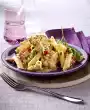 Cook spaghetti in boiling salted water for about 8 minutes, then drain. Drain artichoke hearts and cut in half. Clean and wash the peppers and spring onions. Cut the bell peppers into fine strips and the spring onions into rings.