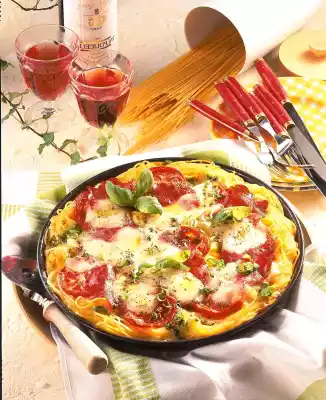 Whisk milk and eggs carefully. Season with salt and pepper. Stir in the Gouda. Drain the spaghetti and put it into a greased pizza form (approx. 26 cm Ø) or into a springform pan of an appropriate size