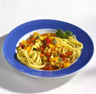 Deglaze with vegetable stock, bring to the boil, cover and braise over medium heat for about 10 minutes. Meanwhile cook spaghetti in boiling salted water for about 10 minutes. Drain and let drain. Stir marjoram into the sauce and season with salt, pepper and sugar.