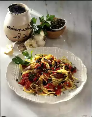 Remove the seeds from the chilli pepper and cut into fine rings. Drain capers. Heat olive oil in a pot, fry onions and garlic until transparent. Add anchovies and chilli and steam briefly. Add the chopped tomatoes, olives and capers, bring to the boil and simmer for 5-10 minutes. Meanwhile, put spaghetti in plenty of boiling salted water and cook for about 8 minutes until bubbly. Wash parsley, dab dry and chop finely, except for a little bit for garnishing. Season sauce with salt and pepper. Pour spaghetti on a sieve, drain and mix with the sauce.