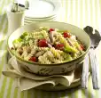 Break the spaghetti into smaller pieces and cook in boiling salted water according to the package instructions. In the meantime clean and wash the peppers and cut them into fine strips. Peel the skin from the sausage. Slice the cucumbers and cut the sausage into strips. Drain pickled peppers, collect 2 tablespoons of liquid.