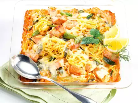 Place the noodles as nests on a small tray (28 x 22 cm). First spread salmon and spring onions, then the sauce on top. Sprinkle with cheese. Bake in the preheated oven (electric cooker: 225 °C/ convection oven: 200 °C/ gas: level 4) for about 12 minutes.