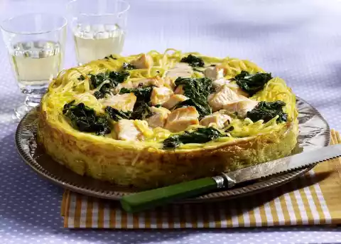 Pile the spaghetti into the mould. Mix eggs and milk, season with salt, pepper and nutmeg. Pour over the spaghetti. Spread spinach and salmon on top. In a preheated oven (electric cooker: 200 °C/ convection oven: 175 °C/ gas: level 3) 45-5
