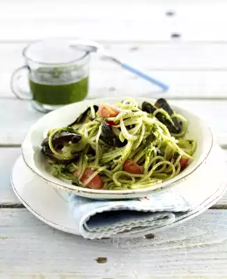 Mix tomatoes, pasta, pesto and mussels. Arrange on plates.