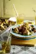 Add the tomato paste and sauté briefly. Season with salt, pepper and coriander. Deglaze with soy sauce, wine and stock, bring to the boil and simmer at medium heat for about 8 minutes. Add the spring onions about 2 minutes before the end of the cooking time