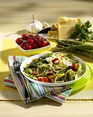Prepare spaghetti in boiling salted water according to package instructions. Heat the oil in a frying pan. Sauté the asparagus in it. Add garlic and onion and fry briefly. Season with salt and pepper.