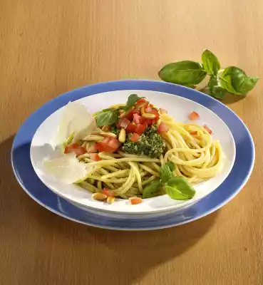 Cook the pasta in plenty of lightly salted water for 10-12 minutes until al dente. Wash and clean the tomato, dice the flesh roughly. Season with salt. Drain noodles and mix with pesto. Sprinkle with 10 g pine nuts and diced tomatoes. Garnish with basil