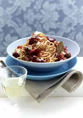 Cut the beetroot into cubes, add to the bolognese and braise for another 2 minutes. Season to taste with salt and pepper. Drain spaghetti, arrange on deep plates with the bolognese and crumble feta cheese over it