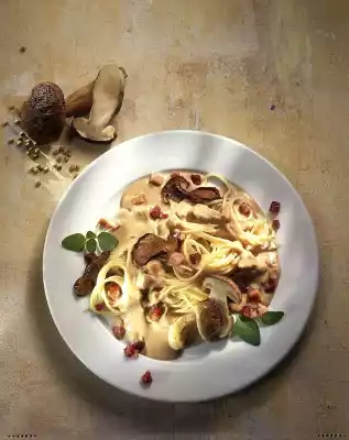 Cook the pasta according to the instructions on the packet. In the meantime soak the mushrooms in 3/8 l warm water. Dice the bacon and leave it crispy. Drain the mushrooms (collect the stock) and sweat briefly. Deglaze with mushroom water and broth.