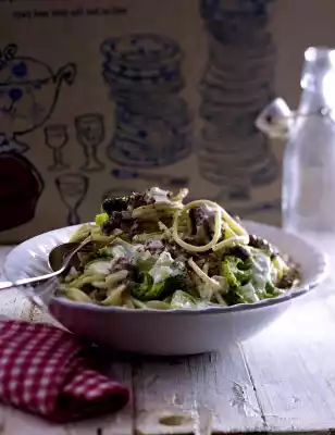 Drain the pasta and let it drain. Put them back into the pot. Season the sauce with salt and pepper, add to the noodles, mix everything and serve immediately