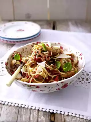Slice the cheese into shavings and tear the meat into small pieces with 2 forks. Mix pasta, sauce, pasta water and meat and serve. Sprinkle with cheese and garnish with basil