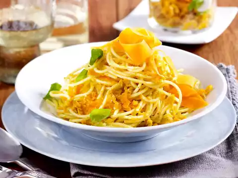Cook the pasta in boiling salted water according to the instructions on the packet. Blanch carrot strips in boiling salted water for 2-3 minutes. Pour pasta into a sieve, quench briefly and drain. Mix pasta and pesto in a saucepan. Arrange on plates. Garnish with remaining basil leaves and carrot strips