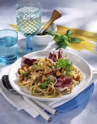 Clean the chanterelles thoroughly, wash them if necessary and then drain them well. Cut the bacon into fine strips. Peel shallots and garlic and dice finely. Clean, wash and slice the radicchio and drain well. Put pasta in boiling salted water and cook for about 11 minutes.