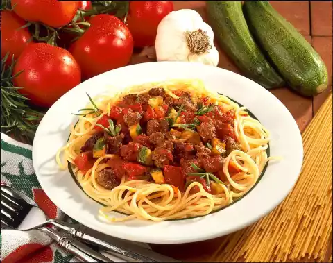 Cook the pasta in boiling salted water for about 12 minutes. Clean, wash and cut the zucchini into pieces. Peel onion and garlic and chop finely. Heat oil in a pan. Fry the minced meat, onions, garlic and courgettes.
