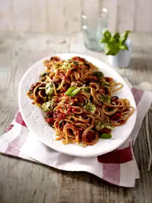 Season with salt and pepper. After about 5 minutes add onion and garlic. Add the tomatoes, chop with a spatula, bring to the boil and simmer for about 10 minutes. Season to taste with salt and pepper. Stir in bacon
