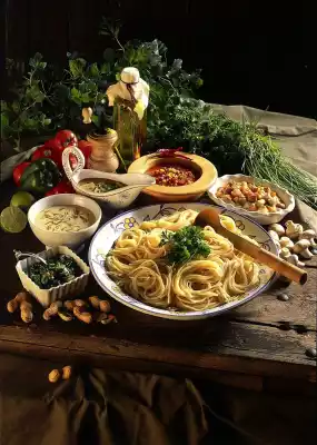 Garnish the pasta with herb bouquets and serve with the sauces.
