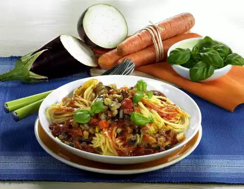 Pour spaghetti on a sieve. Season aubergine-bolognese with salt and pepper and stir in basil. Arrange spaghetti with sauce in deep plates and serve garnished with the remaining basil.