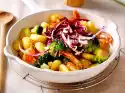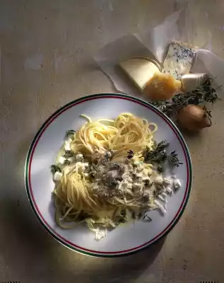 Add cheese and let it melt while stirring. Stir in cream and bring to the boil once. Pluck the thyme leaves from the stems and add to the sauce. Season to taste with salt and pepper. Cook the pasta in boiling salted water for about 10 minutes and drain.
