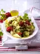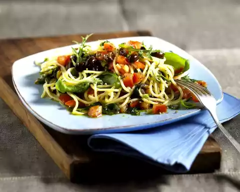 For the pasta, boil 3-4 l salted water. Wash and quarter the tomatoes and cut them into small cubes. Wash the basil and remove the leaves. Coarsely chop green olives. Clean, wash and chop the arugula.