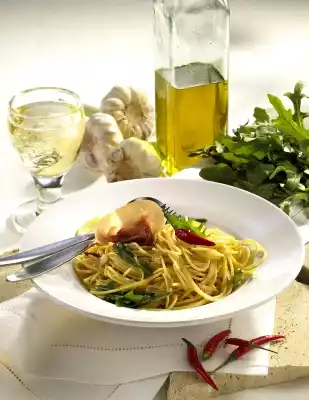 Heat the oil in a pot. Sauté garlic and chilli in it. Drain the spaghetti and toss in the seasoning oil. Season with salt. Fold in rocket. Arrange spaghetti with Parma ham and garnish if necessary
