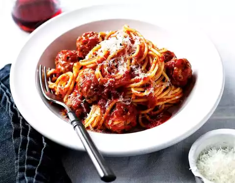 Warm the meatballs in the sauce. Drain spaghetti, drain well and mix with the sauce. Serve with the rest of the parmesan.