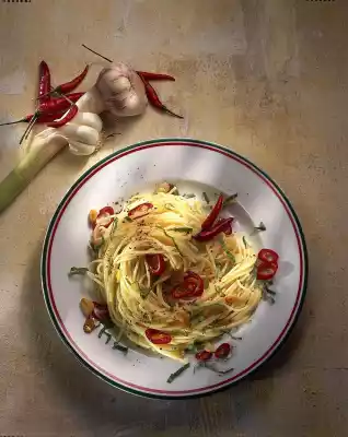 Cook the pasta according to the instructions on the packet. In the meantime peel garlic and cut into slices. Carve pepperoni lengthwise, remove seeds and wash. Cut into very thin rings. Wash and finely chop the basil.