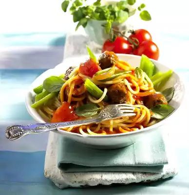 Peel and halve the onion and cut into strips. Prepare spaghetti in boiling salted water according to package instructions. In the meantime heat oil. Fry the balls all around. Add onion and tomatoes, also fry.