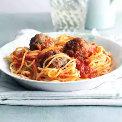 Boil the spaghetti in a large pot of salted water until they are al dente, i.e. still have some bite. Drain and place on a serving dish. Bring the sauce with the dumplings to a boil. Spread over the spaghetti and add the freshly grated Parmesan cheese. And don't forget to stuff the napkin into your shirt collar! Tastes great with polenta too