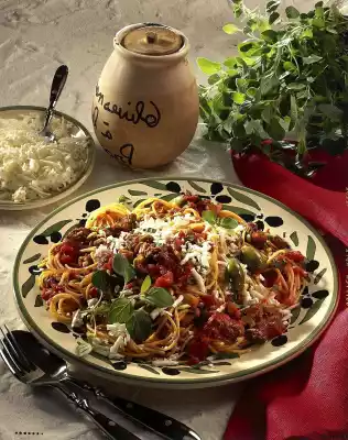 Simmer the sauce in an open pot for 5-10 minutes. Meanwhile cook spaghetti in plenty of boiling salted water for about 10 minutes. Coarsely grate the feta cheese. Pour the finished spaghetti onto a sieve and drain. Mix spaghetti with minced olive sauce and spread on plates. Sprinkle with feta cheese and remaining olives and serve garnished with fresh oregano as desired