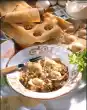 Peel onion and garlic. Chop the onion finely, press the garlic through a garlic press. Coarsely chop the olives, except for a few for garnishing. Heat the oil in a pan, crumble the minced meat into it and fry it thoroughly. Finally add onions and garlic and fry briefly. Then add chopped olives, tomato sauce and stock and season with salt, pepper and oregano.