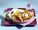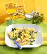 Season with salt and pepper. Cook the pasta in plenty of boiling salted water for about 10 minutes. Cut ham slices into small pieces. Wash chives, dab dry and cut into small rolls. Drain noodles and mix with sauce, ham and chives.