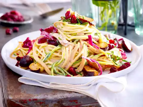 Cook the spaghetti in 3-4 l boiling salted water (1 teaspoon salt per litre) according to the instructions on the packet. Heat oil in a large frying pan. Fry the mushrooms for 5-6 minutes. After about 3 minutes fry oyster mushrooms and onion. Deglaze with vinegar and simmer for 1-2 minutes until the vinegar has evaporated. Add sour cream, bring to the boil and simmer for about 5 minutes. Add zucchini about 2 minutes before the end of cooking time. Season to taste with salt and pepper.