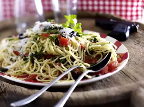For the noodles, bring 3-4 l salted water (approx. 1 teaspoon salt per litre) to the boil. Coarsely chop the olives and capers. Wash and coarsely dice the tomatoes. Peel garlic, chop coarsely and sprinkle with salt.