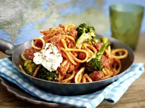 Wash the broccoli and divide into small florets. Peel and chop the onion. Heat the oil in a large pan. Press the mince directly from the skin into the fat in large crumbs.