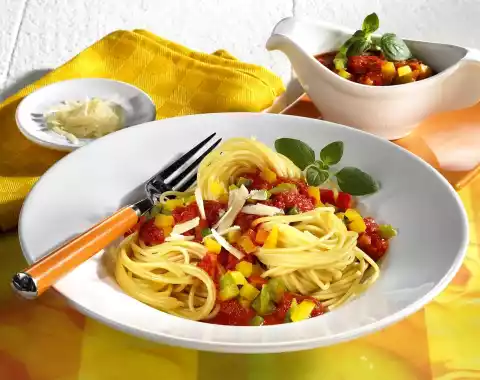 Cook spaghetti in boiling salted water for about 10 minutes. Cut the remaining peppers into small cubes. Remove from heat and puree the peppers in the juice. Add the diced peppers. Season sauce with vinegar, salt and pepper.