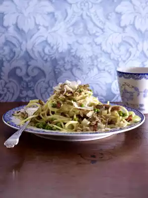 Pour the finished spaghetti into a sieve, drain and put it back into the pot. Add the pea pan and fold in. Mix parmesan slices and breadcrumbs. Arrange pasta and cheese crumbs on plates