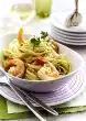 Cook the spaghetti in boiling salted water for about 10 minutes. In the meantime, peel the prawns and remove the gut. Heat 2 tablespoons of oil in a frying pan and fry the prawns. Season with salt, pepper and lemon juice and add to the sauce.