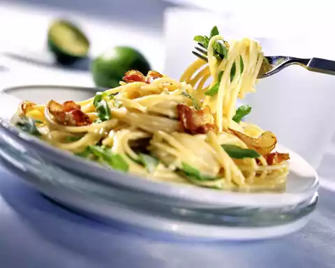 Cook the pasta in boiling salted water for about 8 minutes. In the meantime, clean, wash and roughly chop the rocket. Peel onions, cut into fine slices. Cut bacon into small pieces.